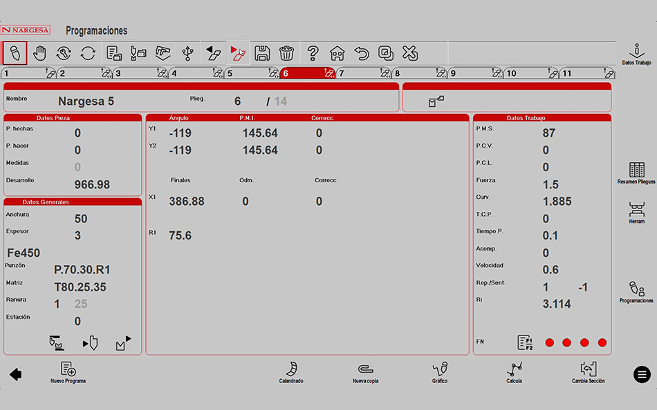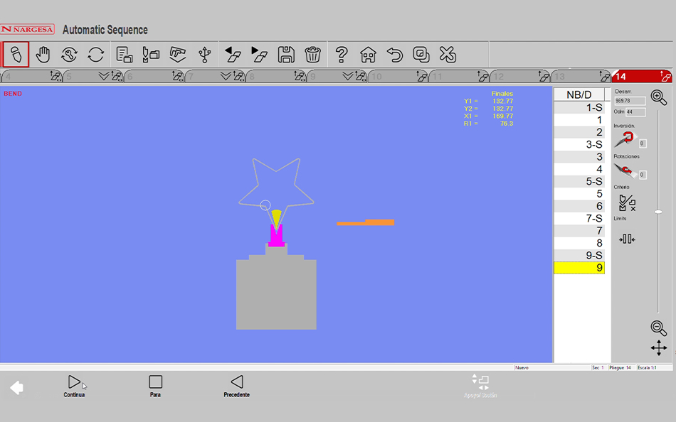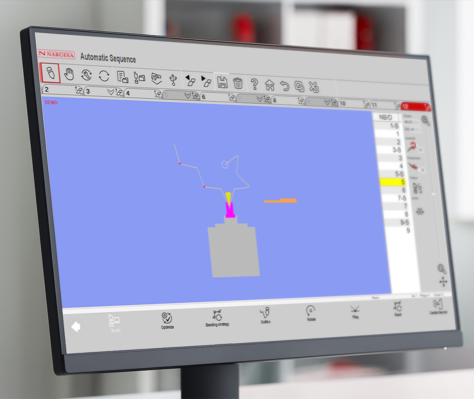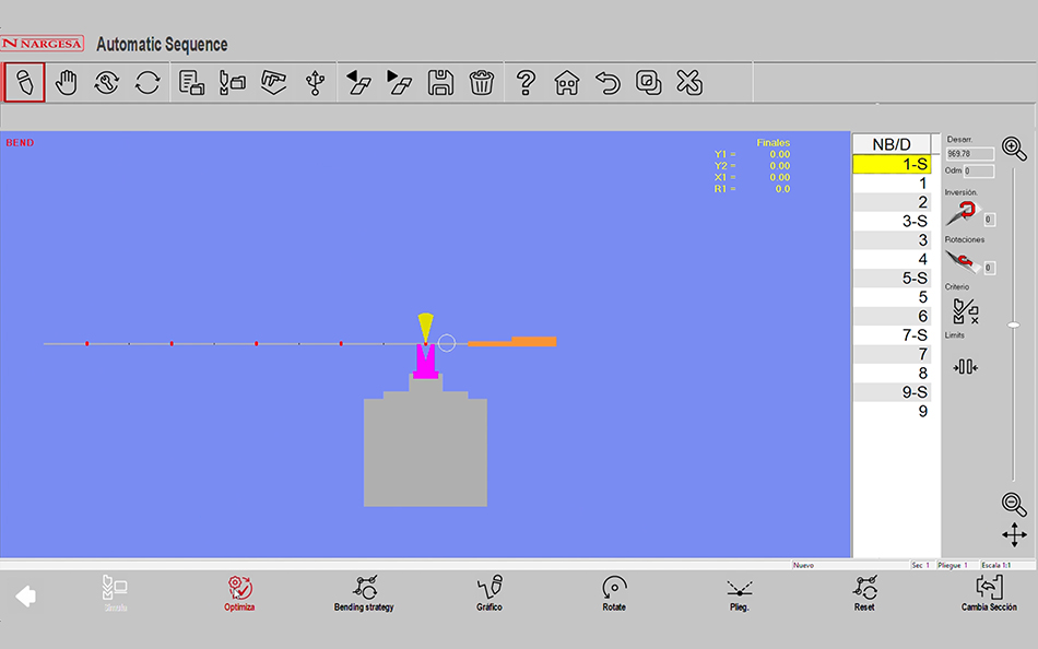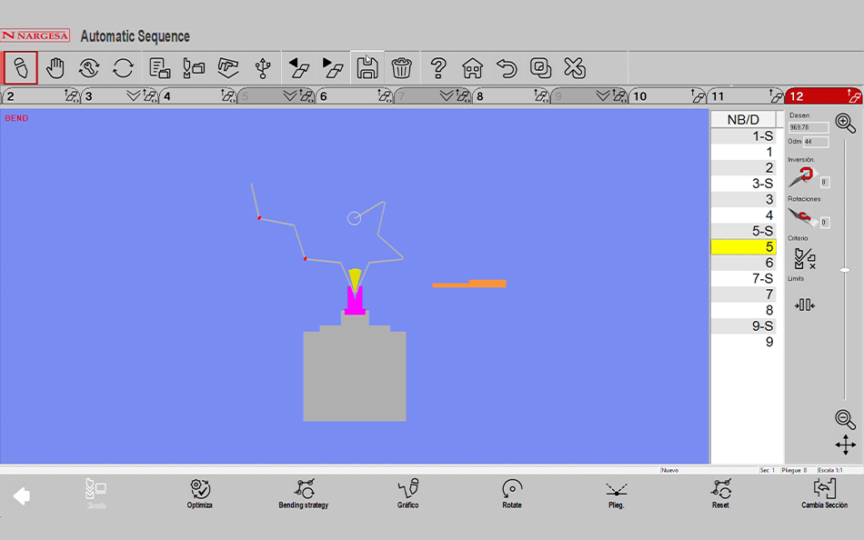 Optimització de Seqüències: Permet optimitzar l’ordre dels plegats mitjançant generació gràfica 2D i ajustar els paràmetres de plegat per proporcionar la seqüència més eficient i segura per a l’operari.